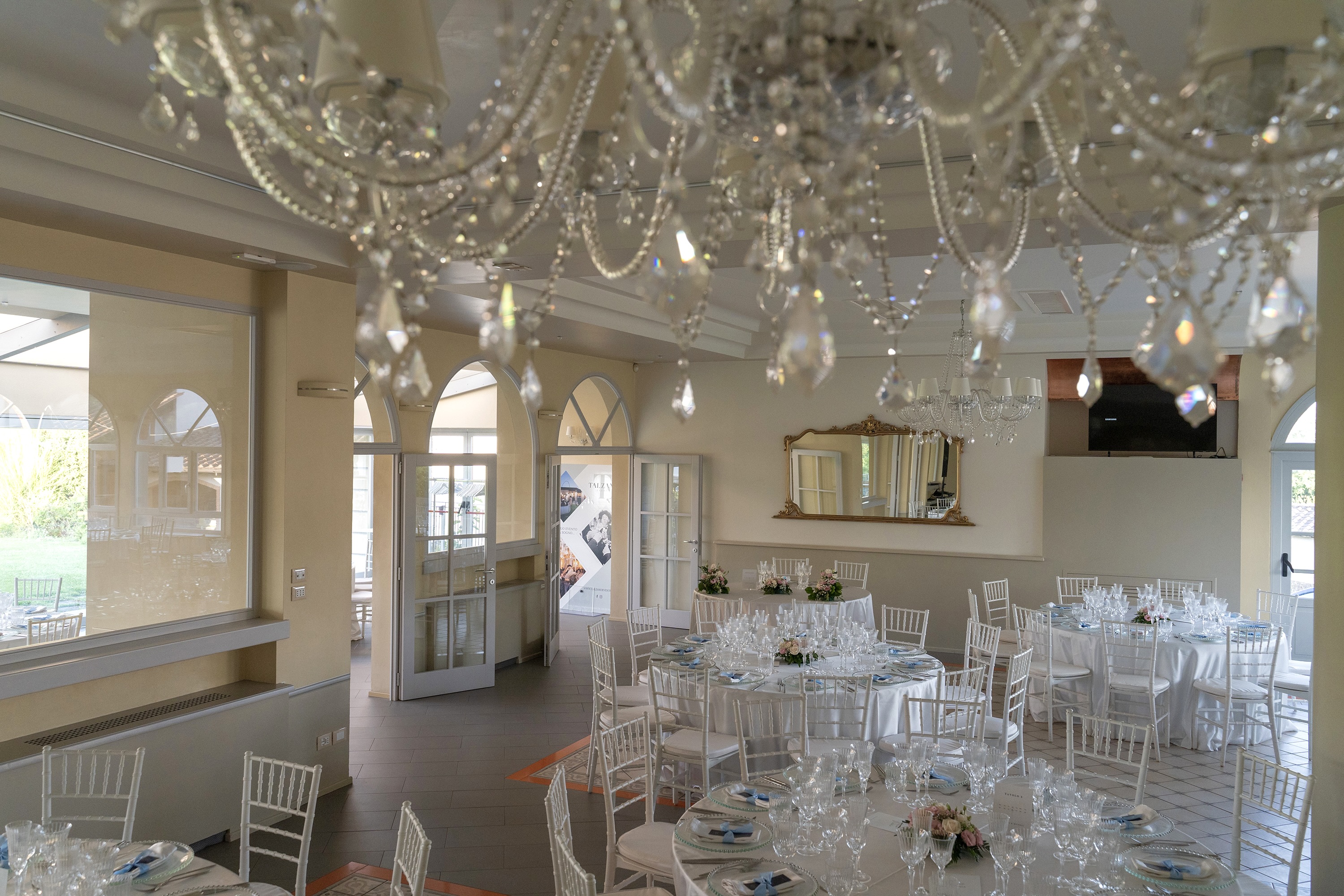 Its modern versality is accentuated by the adjacent veranda (The Emerald Room) with antique mirrors, elegant crystal chandelier and tender wall coverings which can become one with the garden.